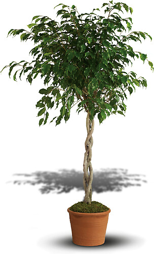 A potted ficus plant with slender, winding stems and a thick bush of leaves on top is potted in a terra-cotta pot.