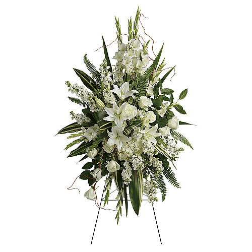 A peaceful display of your heartfelt sympathy, this pure white spray of hydrangea, roses and lilies brings a natural serenity to the service.